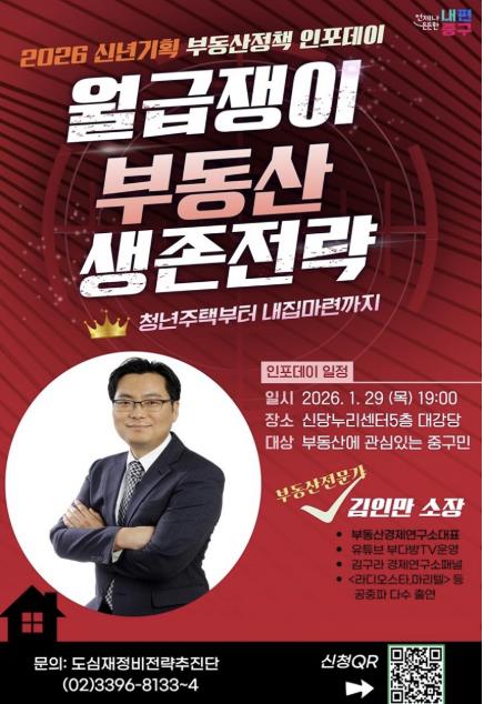 [뉴스앤톡] 서울 중구가 급변하는 부동산 환경 속에서 주민들의 현실적인 대응 전략을 돕기 위해 오는 29일 저녁 7시 신당누리센터 5층 대강당에서 올해 첫 도시런(learn) 스쿨‘신년기획 부동산 전략 인포(INFO)데이’를 연다.