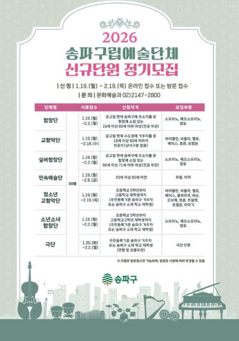모집 기간은 단체별로 상이하며, 최대 2월 19일까지다. 입단을 희망하는 구민은 송파구청 홈페이지 고시·공고란에서 단체별 자격 조건과 모집 부문을 확인한 후, 응시 서류를 작성해 이메일로 제출하거나 송파구청 문화예술과로 방문 접수하면 된다.