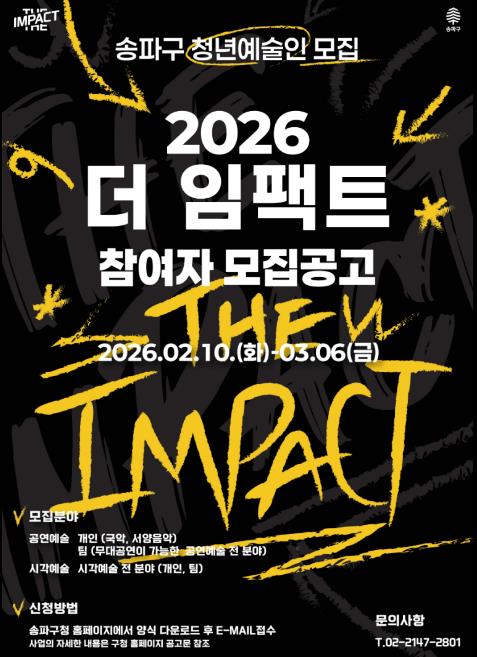 [뉴스앤톡] 서울 송파구는 재능 있는 청년예술인을 발굴·지원하는 ‘2026 더 임팩트’ 참가자를 오는 3월 6일 오후 5시까지 모집 중이라고 23일 밝혔다. 이번 공모는 지난 2월 10일부터 접수가 진행되고 있다.