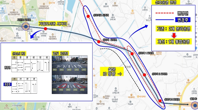 아울러 상지석 교차로부터 설문나들목(IC) 구간까지는 기존 2개로 운영되던 신호 연동체계를 1개 그룹으로 통합하여 출근시간에는 나들목(IC) 방향, 퇴근시간에는 신도시 방향 중심으로 교통 흐름이 원활히 유지되도록 최적화할 방침이다.