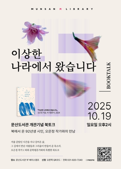 이번 행사는 문산도서관이 새로 선보이는 평화 특화사업의 하나로, 분단과 정착의 경험을 문학을 통해 시민과 함께 나누고 공감의 장을 마련하고자 기획됐다. 작가와의 만남에서는 오은정 작가의 창작 과정과 삶의 이야기를 중심으로, 문학평론가 허희가 진행을 맡아 대화를 이끌 예정이다. 행사 종료 후에는 ‘현장 사인회’가 진행되어, 참여자들은 작가와 직접 소통할 수 있다.