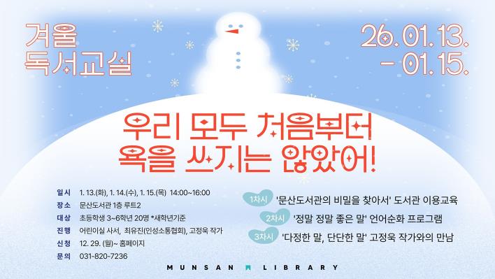 [뉴스앤톡] 파주시 문산도서관은 오는 13일부터 15일까지 사흘간 2026년 문산도서관 겨울독서교실을 운영한다.