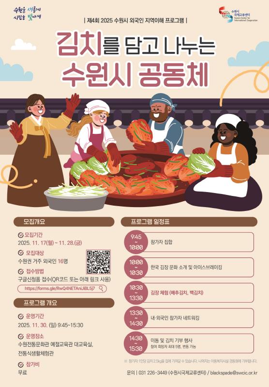 11월 30일 수원시 전통문화관에서 열리는 이번 프로그램에서는 수원시 대학생 공공외교단이 한국의 김장 문화를 소개하고, 외국인 주민과 함께 김치를 담근다. 이날 만든 김장은 사회복지법인 경동원에 전달될 계획이다.