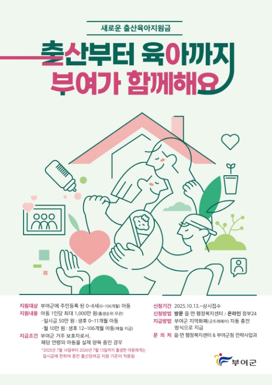 [뉴스앤톡] 부여군이 저출산 위기에 대응하기 위해 기존 출산장려금 제도를 ‘출산육아지원금’으로 전면 개편하고, 오는 10월 13일부터 신청을 시작한다.