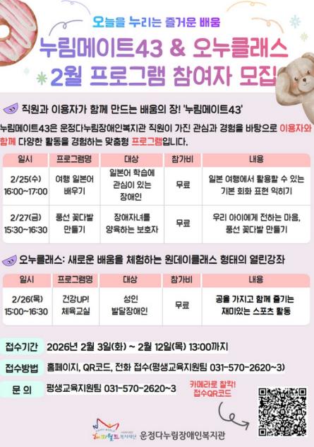 [뉴스앤톡] 파주시 운정다누림장애인복지관은 참여형 평생학습 프로그램 ‘누림메이트43’을 운영하며, 정규 강좌로는 담기 어려운 소규모 학습 수요를 반영한 생활 밀착형 배움을 실천하고 있다.