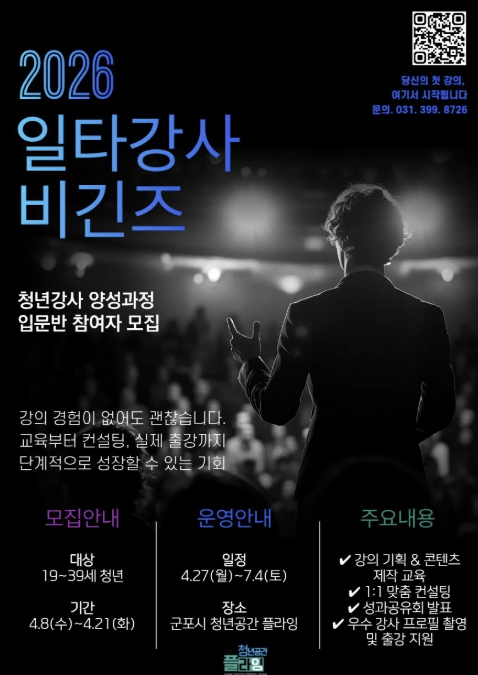 [뉴스앤톡] 군포시 청년공간 플라잉(센터장 조남)은 강의 역량을 갖춘 청년을 발굴하고 전문 강사로 성장시키는 ‘2026년 일타강사 비긴즈’의 입문반 참여자를 오는 21일까지 모집한다.