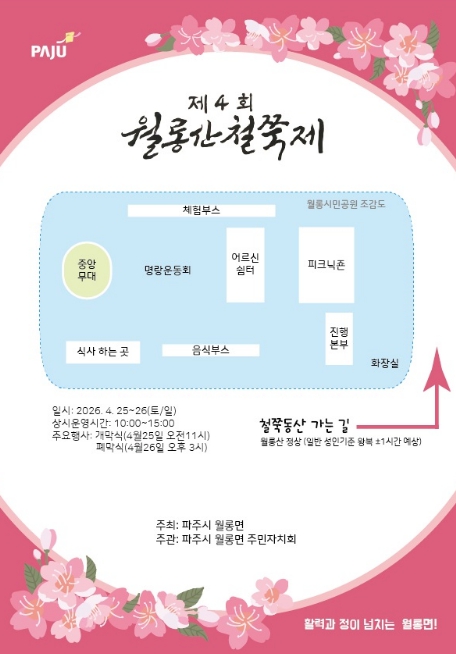 [뉴스앤톡] 파주시 월롱면이 주최하고 월롱면 주민자치회가 주관하는 ‘제4회 월롱산 철쭉제’가 오는 4월 25일부터 26일까지 이틀간 월롱시민공원(월롱면 덕은리 산 134-1, 월롱배수지)에서 개최된다.