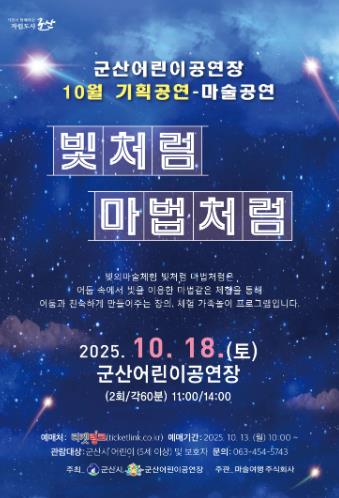[뉴스앤톡] 군산어린이공연장이 오는 10월 18일 어린이들의 상상력과 창의력을 자극하는 특별한 체험형 공연 '빛처럼 마법처럼'을 선보인다.