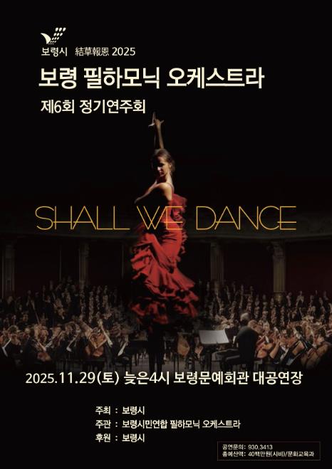 [뉴스앤톡] 보령시민연합 필하모닉 오케스트라가 오는 11월 29일 오후 4시 보령문화예술회관 대공연장에서 제6회 정기연주회 ‘Shall We Dance’를 개최해 시민들에게 특별한 음악적 감동을 선사한다.