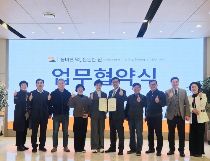 | ▲ 수원시 신중년센터와 수원덕산병원 관계자가 업무협약을 체결하고 기념사진을 촬영하고 있다. |