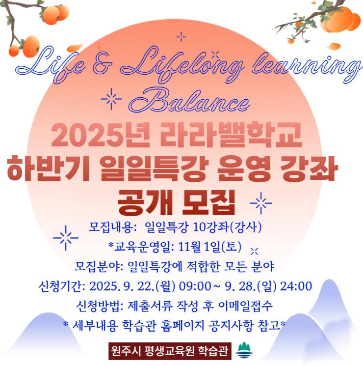 [뉴스앤톡] 원주시 평생교육원 학습관은 9월 22일부터 28일까지 2025년 라라밸학교 하반기 일일특강 운영 강좌(강사)를 모집한다.