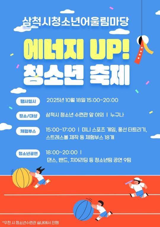 [뉴스앤톡] 삼척시청소년수련관은 오는 10월 18일 오후 3시부터 관내 청소년과 가족을 대상으로 2025 삼척시청소년어울림마당 『에너지 UP! 청소년축제』를 개최한다.