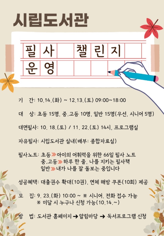 특히 10월 18일과 11월 22일 오후 2시에는 시립도서관 2층 프로그램실에서 대면 필사 시간을 운영하며, 그 외 기간에는 종합자료실에서 필사 노트를 수령해 자유롭게 필사할 수 있다.