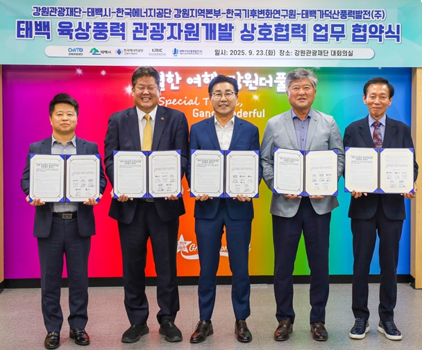 [뉴스앤톡] 강원관광재단은 지난 9월 23일 태백시, 한국에너지공단 강원지역본부, 한국기후변화연구원, 태백가덕산풍력발전㈜과 함께 ‘육상풍력 관광자원 개발을 위한 상호 협력 협약’을 체결하고 폐광지역 관광의 새로운 미래를 열겠다고 밝혔다.
