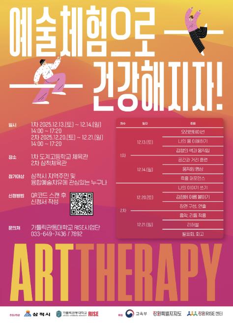 [뉴스앤톡] 삼척시는 가톨릭관동대학교 RISE 사업단과 협력하여 지역 자연자원을 활용한 ‘융합예술치유 프로그램’을 오는 12월 도계고등학교 체육관과 삼척체육관에서 개최한다.