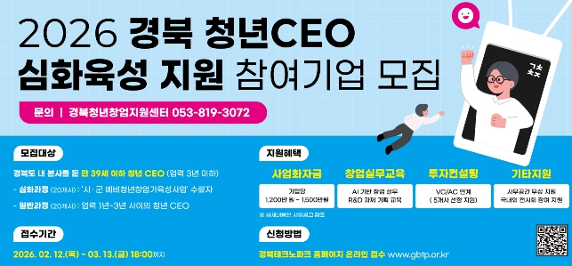 [뉴스앤톡] 경상북도는 창업 초기 청년기업의 안정적인 정착과 성장을 지원하기 위해 오는 3월 13일까지 ‘2026 경북 청년CEO 심화육성 지원사업’참여 기업 40개사를 모집한다.
