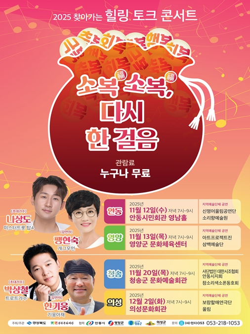 이번 행사는 12일 안동시민회관 영남홀을 시작으로, 13일 영양군문화체육센터, 20일 청송군문화예술회관, 12월 2일 의성문화회관에서 각각 오후 7시에 열리며, 관람은 무료다.