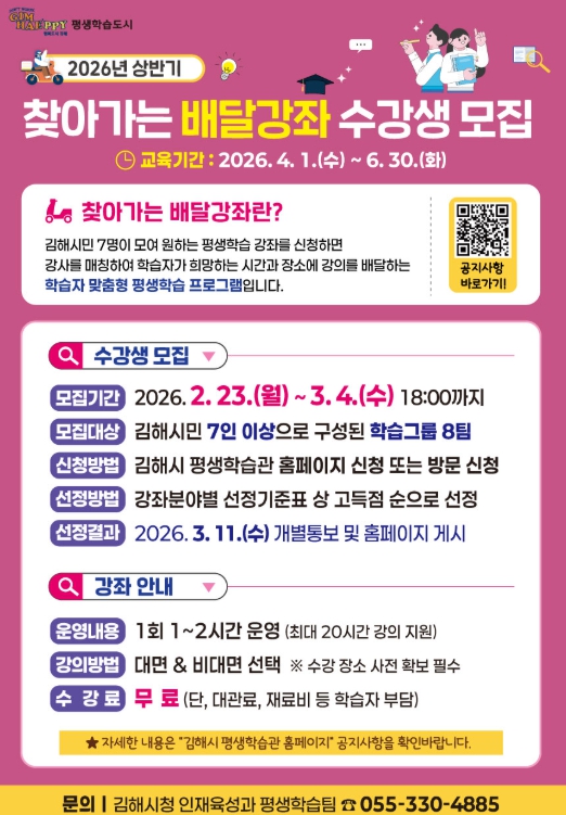[뉴스앤톡] 김해시는 오는 3월 4일까지 상반기 찾아가는 배달강좌 학습자를 모집한다고 23일 밝혔다.