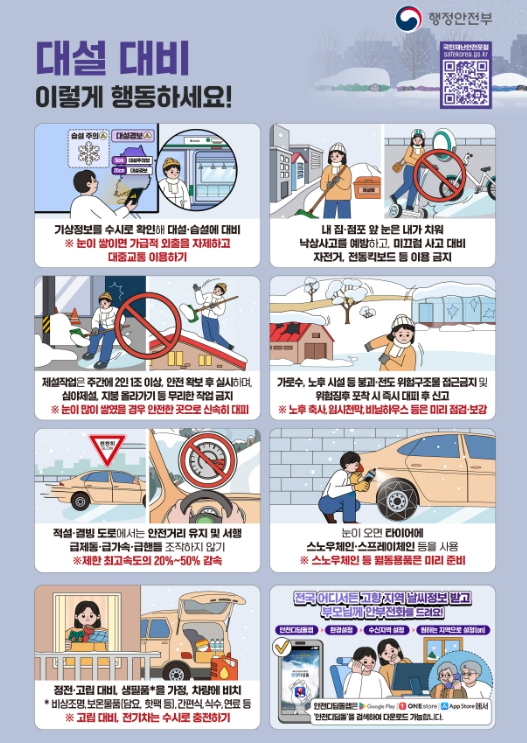 대설 시에는 △내 집과 내 점포 앞 눈은 스스로 치우기, △비닐하우스·축사 등 시설물의 눈 제거 및 보강, △도로변 주차 자제와 대중교통 이용, △등산객의 신속한 하산, △고립 우려 지역 주민의 사전 대피 등을 강조했다.