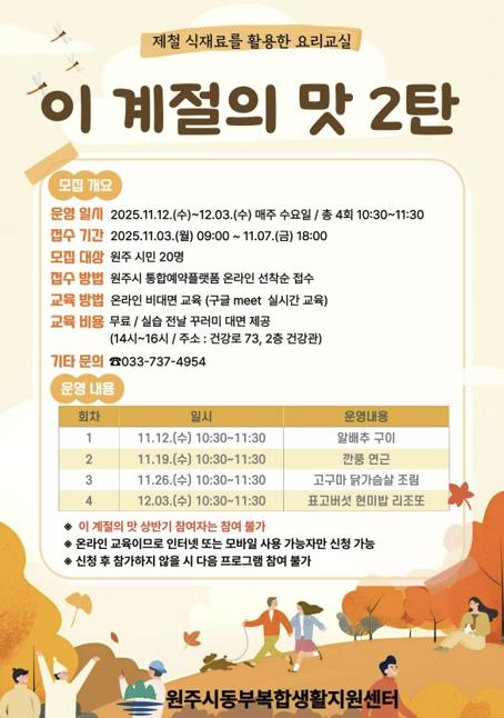 [뉴스앤톡] 원주시 동부복합생활지원센터는 오는 11월 3일부터 ‘이 계절의 맛 2탄’ 건강 요리 교실 프로그램 참여자를 모집한다.
