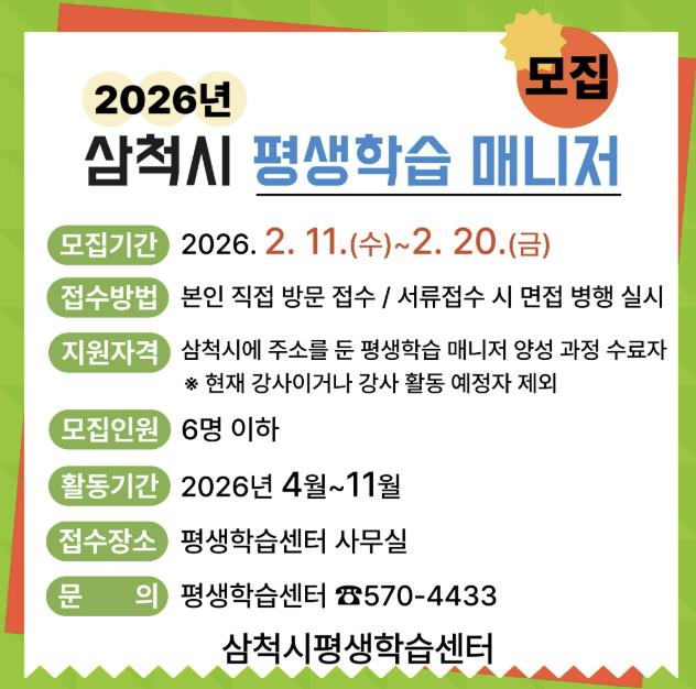 [뉴스앤톡] 삼척시는 2월 11일부터 20일까지 평생학습 매니저 양성과정 수료자를 대상으로 2026년 삼척시 평생학습 매니저를 모집한다고 밝혔다.