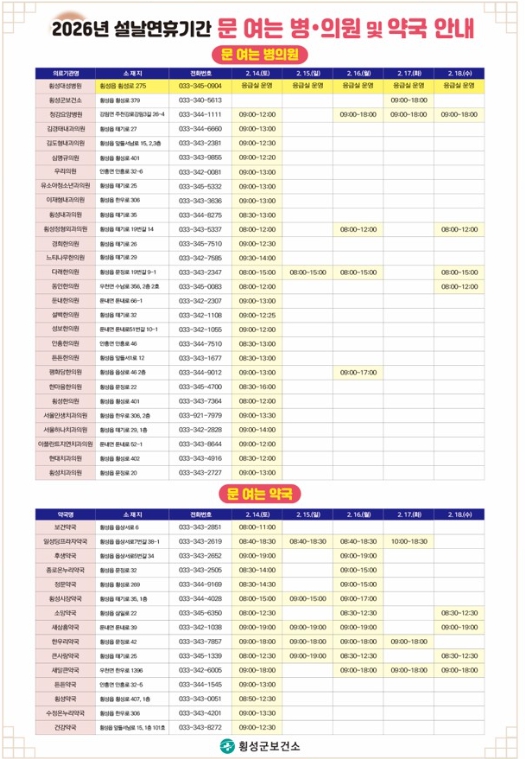 횡성군보건소에 따르면 2월 17일 설날 당일에는 보건소에서 오전 9시부터 오후 6시까지 진료를 실시해, 연휴 기간 발생할 수 있는 경증 환자 및 응급 상황에 대비할 계획이다.