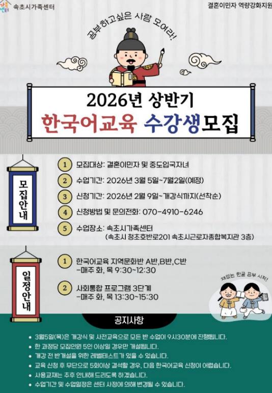 | ▲ 2026년 상반기 한국어교육 수강생 모집 홍보문 |