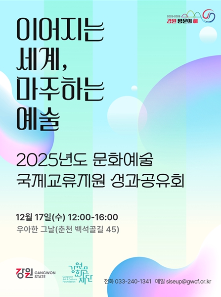 [뉴스앤톡] 강원문화재단은 2025년도 문화예술 국제교류지원사업에 참여한 예술인들과 함께 12월 17일 춘천에서 성과공유회 '이어지는 세계, 마주하는 예술' 행사를 성황리에 마무리했다고 밝혔다.