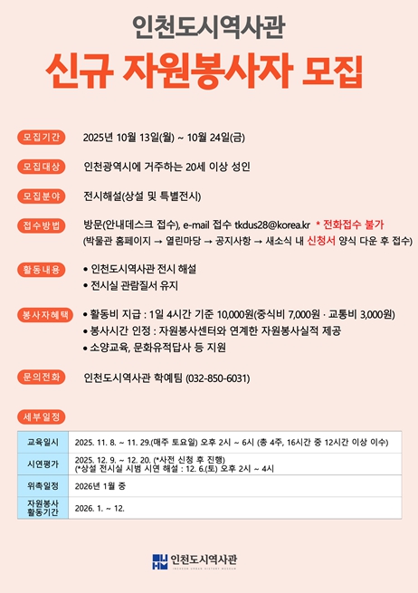 이번 모집은 인천의 역사와 문화에 대한 이해를 높이고 시민에게 다양한 봉사 기회를 제공하기 위한 것으로, 선발된 자원봉사자는 전시해설과 전시실 관람질서 유지 활동을 수행하게 된다.