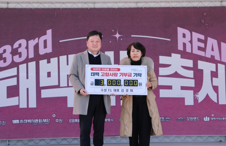 [뉴스앤톡] 태백시는 2월 8일 태백산국립공원 당골광장에서 열린 제33회 태백산 눈축제 현장에서 태백 출신 기업인 김경미 수성 F.L 대표가 고향사랑기부금 300만 원을 기탁했다고 밝혔다.