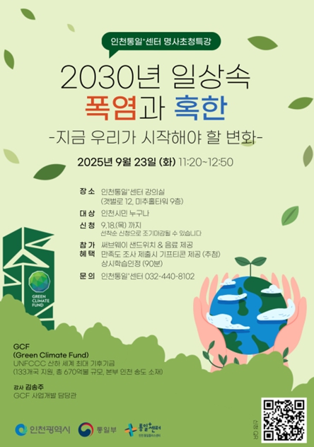 [뉴스앤톡] 인천광역시는 9월 23일 인천통일플러스센터(연수구 송도동 소재)에서 녹색기후기금(GCF)의 전문가를 초청, 기후위기의 심각성과 대응방안을 주제로 하는 특별 강연을 개최했다고 밝혔다.