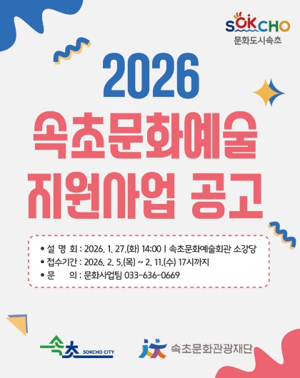 한편, 재단은 문화예술인의 사업 이해도를 높이기 위해 1월 27일 오후 2시 속초문화예술회관 별관 소강당에서 ‘2026 속초문화예술지원사업 설명회’를 연다.