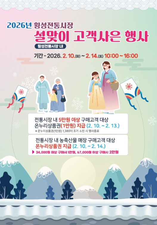 군은2월 10일부터 14일까지 5일간 횡성 전통시장 일원에서 ‘2026년 설맞이 고객 사은 행사’를 개최한다고 밝혔다.