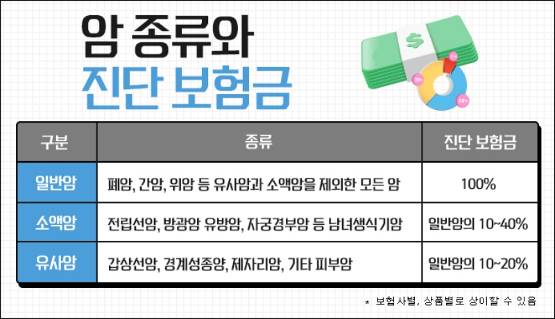 보험사에서 암을 구분할 때 보통 경계성종양, 제자리암, 갑상선암, 기타피부암 등으로 대표되는 유사암과 유방암, 방광암, 전립선암, 자궁암 등으로 대표되는 소액암, 그리고 뼈암이나 뇌암, 췌장암 등은 고액암으로 구분한다. 이들을 제외한 나머지 암은 일반암으로 분류한다. 보통 치료비가 많이 드는 고액암이 다른 암보다 진단금이 높은 편이지만, 보장을 넓게 받기 위해서는 일반암 진단비를 늘리는 것이 유리하다. 또한, 소액암이나 유사암은 발생빈도가 높고 상대적으로 치료비가 적게 들어 일반암 진단비의 약 10%~20% 정도만 지급되므로 사전에 보장금액을 알아볼 필요가 있다.