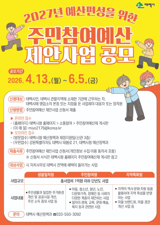 신청은 태백시 홈페이지(소통참여→주민참여예산제)를 통한 온라인 접수와 담당자 이메일, 우편, 시 예산정책과 방문 접수로 가능하다.