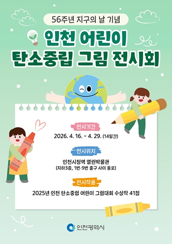 전시장에는 인천 지역 어린이들이 환경 보호와 지구의 미래를 주제로 그린 다양한 작품이 전시되며, 기후 변화, 탄소 저감, 자연 보호 등 다양한 메시지를 어린이들의 시선으로 담아내 관람객에게 새로운 공감과 인식을 전달할 것으로 기대된다.