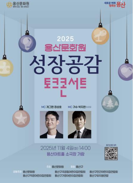 [뉴스앤톡] 서울 용산구는 오는 11월 4일 오후 2시, 용산아트홀(녹사평대로 150) 소극장 가람에서 ‘성장공감 토크콘서트’를 개최한다. 이번 행사는 용산문화원이 주관하고 용산구가 후원한다.