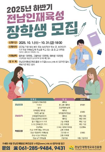 [뉴스앤톡] 전라남도와 전남인재평생교육진흥원은 실질적인 교육기회 보장과 미래인재로의 성장, 지역 정착을 지원하기 위한 2025년 하반기 전남인재육성 장학생을 오는 31일까지 모집한다.