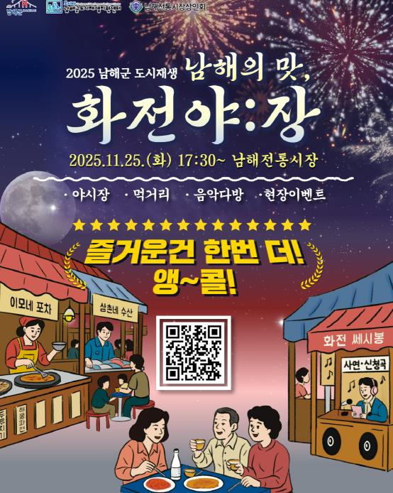 김성현 도시재생지원센터 사무국장은 “지난 행사에 보내주신 관심과 응원에 힘입어 다시 한 번 화전야:장을 준비하게 됐다”며 “이번 앵콜전이 남해읍 전통시장에 새로운 활력을 불어넣고, 겨울밤에 더 따뜻한 만남과 즐거움이 이어지는 계기가 되길 바란다”고 말했다.