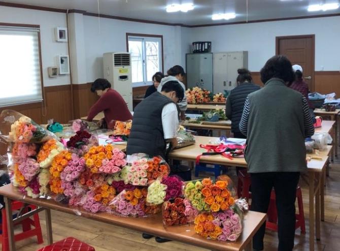 | ▲ 농가들이 장미꽃다발을 만들고 있는 모습. |