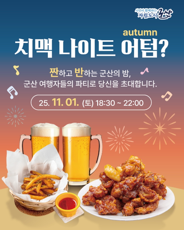 [뉴스앤톡] 깊어가는 가을밤, 군산시가 탁 트인 야외에서 즐기는 특별한 행사 ‘치맥나이트 어텀(Autumn)?’을 11월 1일 저녁 군산 내항 일원에서 개최한다.