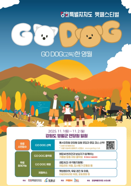 [뉴스앤톡] 강원특별자치도와 영월군이 주최하고 MBN과 HA인터렉션이 주관하는 ‘고독(GO DOG)한 영월’ 펫 페스티벌이 11월 1일부터 11월 2일까지 동서강정원 연당원에서 열린다.