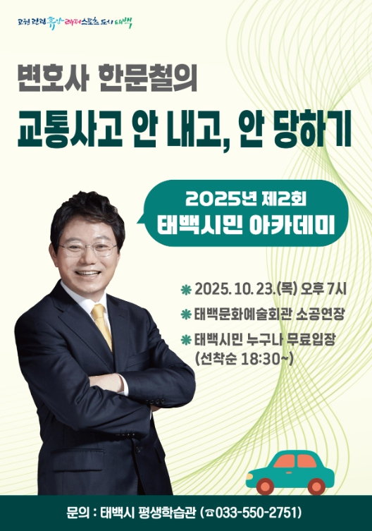 [뉴스앤톡] 태백시는 시민들의 교통안전 의식을 높이고 사고 예방 문화를 확산하기 위해 오는 23일 오후 7시, 태백문화예술회관 소공연장에서 ‘제2회 태백시민 아카데미’를 개최한다고 밝혔다.