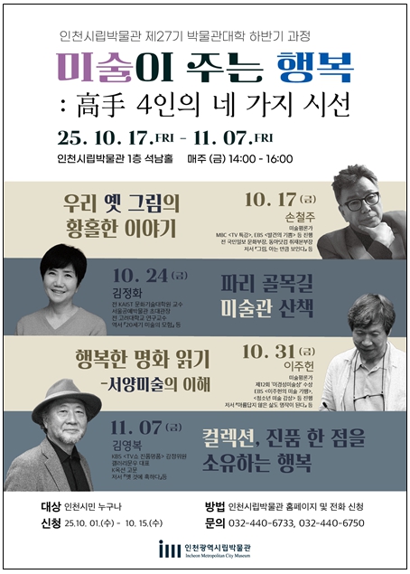 김태익 인천시 시립박물관장은 “이번 강연은 파리의 대형 미술관이 아닌, 골목 속 작은 미술관을 통해 시민들이 미술의 새로운 행복을 발견할 수 있도록 기획했다”며 “현장 전문가의 생생한 이야기로 미술을 삶 가까이에서 느낄 수 있는 특별한 시간이 될 것”이라고 전했다.