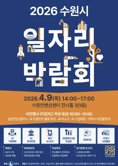 수원시 관계자는 “이번 박람회에서는 특화산업 중심의 일자리 매칭으로 구직자들에게 실질적인 채용 기회를 제공할 것”이라며 “사전 행사인 직업계고 학생 대상 취업 지원 프로그램으로 학생들이 취업 준비 과정에서 필요한 실전 역량을 강화하도록 지원하겠다”고 말했다.