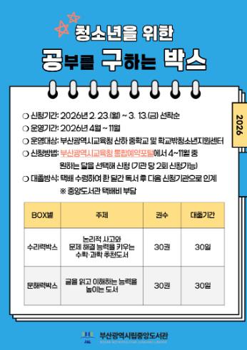 [뉴스앤톡] 부산광역시립중앙도서관은 청소년의 문해력과 수리력 향상을 돕기 위한 도서 단체 대출 서비스인 ‘청소년을 위한 공·구박스(공부를 구하는 박스)’를 운영한다.