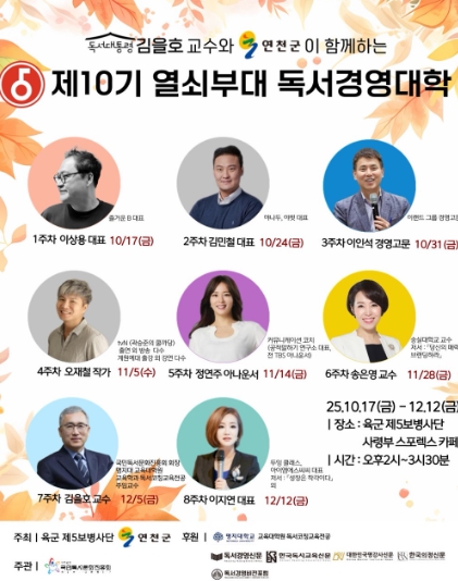 [뉴스앤톡] 연천군과 육군 제5보병사단은 장병들의 지적 성장과 건전한 병영 독서문화 확산을 위한 '열쇠부대 독서경영대학' 제10기 개강식을 오는 10월 17일 개최한다. 이 프로그램은 2023년부터 전국 최초로 민·관·군 협력 독서교육으로 시작됐으며, 매 기수 약 50여 명의 군장병이 수료하며 꾸준한 호응을 얻고 있다.