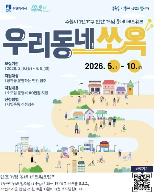 수원시 관계자는 “우리동네 쏘옥은 시민들이 자주 찾는 동네 공간을 소통 거점으로 활용해 1인가구가 자연스럽게 관계를 이어갈 수 있도록 돕는 사업”이라며 “민간 공간 운영자들의 많은 관심과 참여를 바란다”고 말했다.