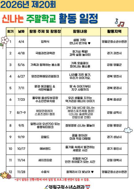 2026년 신나는 주말학교는 4월 4일 입학식을 시작으로 국립과천과학관 견학, 봄소풍, 영천전투메모리얼파크 방문, 해양스포츠 체험 캠프, 에버랜드 체험 등 총 12회에 걸쳐 운영될 예정이다.