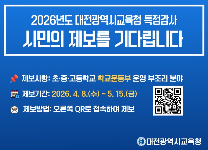 감사 사각지대를 해소하고 현장 중심의 실효성 있는 특정감사를 위해 시민과 학부모를 대상으로 4월 8일부터 5월 15일까지 학교운동부 운영 전반의 부조리에 대한 특정감사 집중 제보 기간을 운영한다.